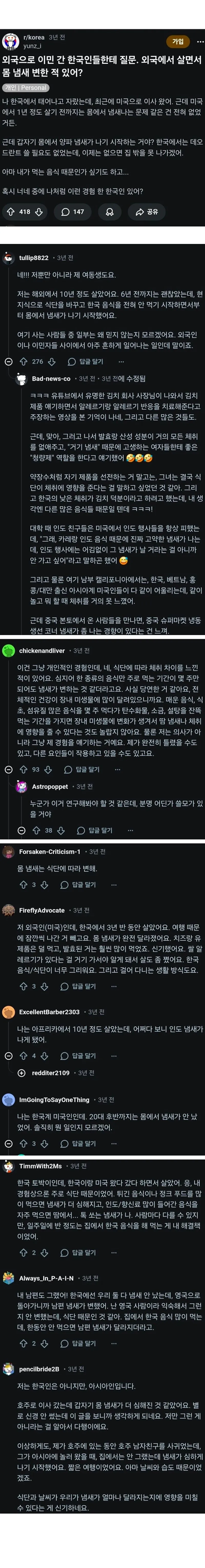 야, 해외에서 살다 보면 체취가 바뀌는 경우가 있다더라. 나도 처음엔 소문인 줄 알았는데, 한국인 친구들 사이에서 비슷한 얘기가 자주 들려. 음식이 그렇게까지 영향을 주나 싶었지만 현지에 오래 살다 보니까 작은 단서들이 자꾸 떠올라. 어떤 날은 데오드란트가 예전만큼 효과 없다고 느낄 때도 있더라.