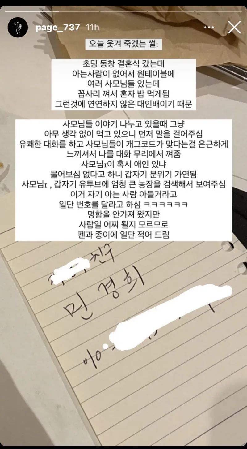 오늘 결혼식장에 다녀왔는데 분위기가 뭔가 심상치 않았다. 자리에 앉아 있는데 옆 테이블에서 비밀스러운 수다 소리가 계속 들려오고, 몇몇 어르신들이 핸드폰을 만지작거리며 뭔가를 확인하는 듯 했다. 특히 소문에 익숙한 사모님들 쪽이 분위기를 주도하자 뭔가를 교환하려는 듯한 눈빛이 오가기도 했다. 나는 이 대화의 행방이 어디까지 확산될지 궁금해지기 시작했다.