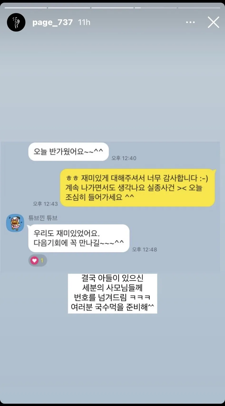 그 분위기 속에서 갑자기 번호를 교환하자는 말이 나왔고, 한 분이 아들 얘기를 꺼내며 관심을 끌었다. 화면 속에 떠 있던 영상이나 농장 얘기를 서로 보여주며 뭔가 중요한 단서를 찾으려는 걸 느낄 수 있었다. 누군가는 유튜브에서 큰 농장을 검색한 것을 자랑스럽게 공유하더니, 예의상이라도 번호를 달라며 팔을 계속 뻗어왔다. 이걸 보고 있던 우리도 모르게 소문이 퍼지기 시작했고, 상황은 점점 더 미묘해졌다.